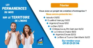 Voici les dates de nos prochaines permanences sur le territoire de l’Indre pour le mois de Février 2026. Vous êtes porteur de projet, vous avez une idée de création d’entreprise, venez nous en parler, pour cela n’hésitez pas à nous
