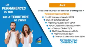 Voici les dates de nos prochaines permanences sur le territoire de l’Indre pour le mois de Avril 2026. Vous êtes porteur de projet, vous avez une idée de création d’entreprise, venez nous en parler, pour cela n’hésitez pas à nous